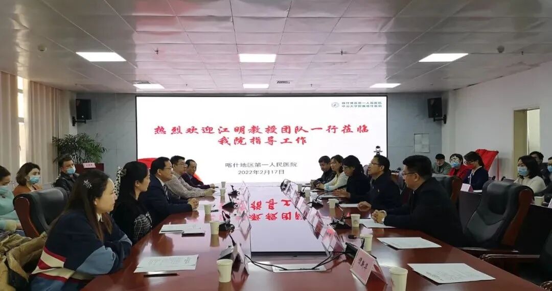 会上,邹小广书记对江明教授团队多年来对我院的关心和支持表示衷心的感谢,并向江明教授介绍了我院发展基本情况及今后的发展定位。他表示,血液内科是我院众多自治区级重点学科之一,经过十余年的发展与沉淀,目前已经成为我区地州级医院中占地面积最大、综合实力最强的血液病专科。江明教授的加入,将会极大促进我院对血液病的研究、造血干细胞移植技术的开展以及加速推动喀什地区血液病质控中心的成立。未来,希望江明教授借助专家工作室平台,通过专家团队下沉、资源共享、医疗技术帮扶及人才队伍培养等多途径,带动提升我院血液专科综合实力。