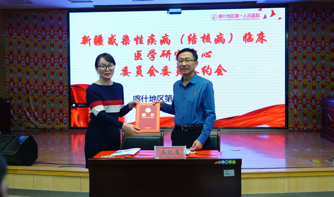 ▲图丨医学检验科主任许爱敏作为新疆感染性疾病(结核病)临床医学研究中心委员会委员代表签约协议,邹小广书记颁发聘任证书![]()