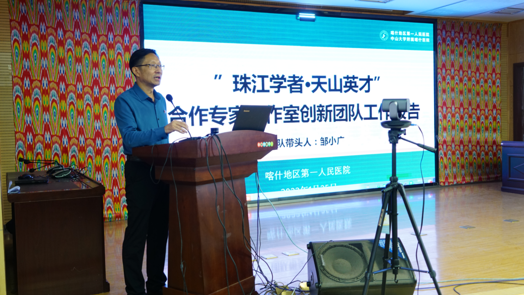 随后,我院党委书记邹小广围绕团队构架及建设、团队开展学术活动情况以及团队培养成效等方面,对“珠江学者•天山英才”合作工作室创新团队工作进行全面介绍汇报,并详细介绍了地区干部人才援疆统筹项目——“第十一批有突出贡献优秀专家 珠江学者”人才工作室支持项目实施计划方案。同时,他还从中心成立背景、中心完成工作情况及中心远景目标三个方面汇报了新疆感染性疾病(结核病)临床医学研究中心的运行情况。