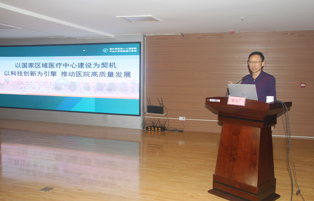 会议最后,邹小广书记对麦盖提县委一直以来对我院下沉干部的关心关爱表示衷心感谢,对县医院不遗余力全面支持配合医疗资源下沉工作表示充分肯定,对阿布力米提·阿不都哈力克同志一年多来的帮扶工作给予了高度赞赏,并以《以国家区域医疗中心建设为契机 以科技创新为引擎 推动医院高质量发展》为题进行专题授课分享。