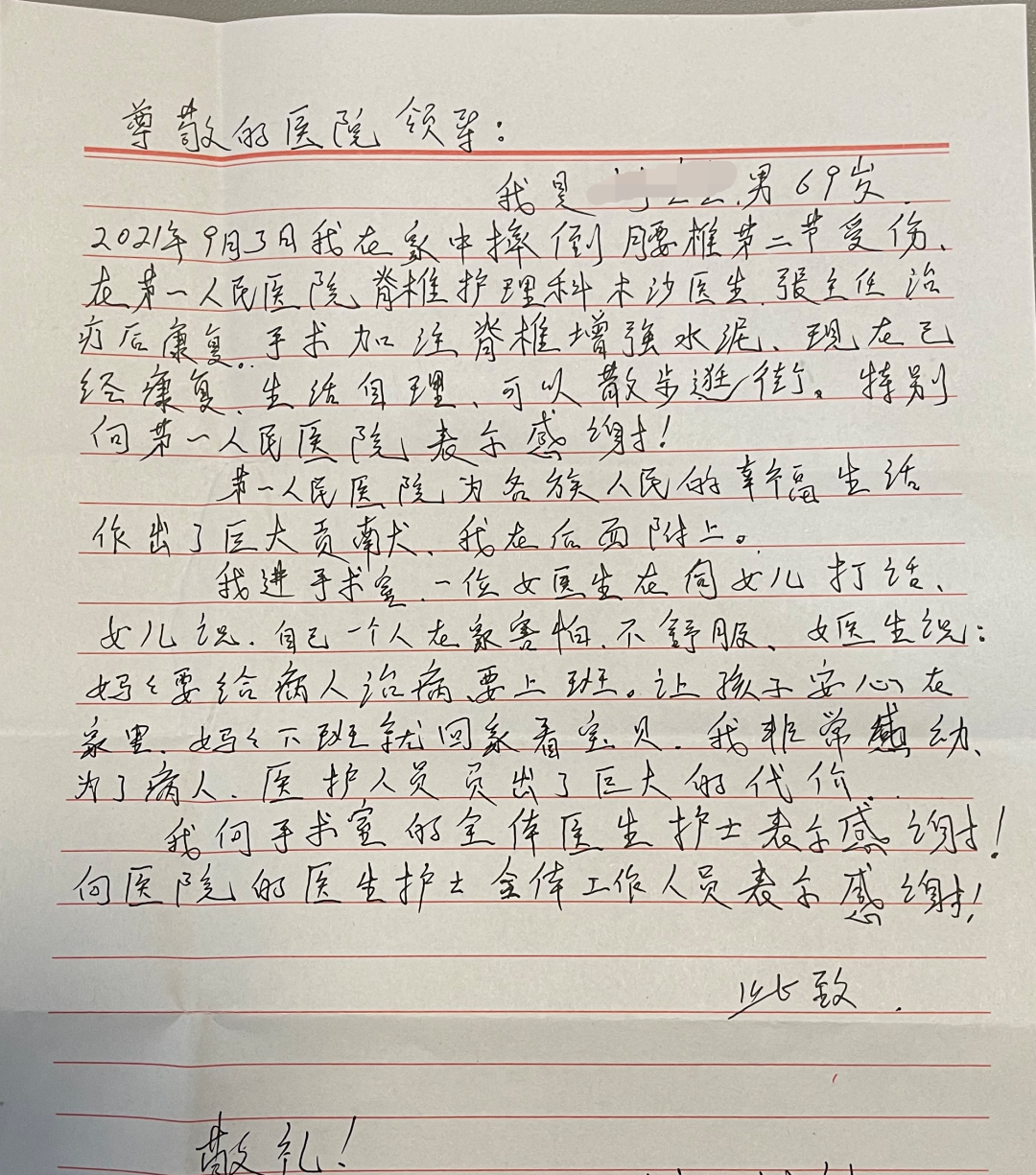 刘先生在信中写道:williamhill威廉希尔官网给了我第二次生命,多年来尽心尽力守护着我们全家人的健康。我的生活中也有许多williamhill威廉希尔官网创造的生命奇迹,许多医生和护士都为各族人民的幸福生活作出了巨大贡献!我不知道他们的名字,仅能通过医院领导向他们致以最崇高的谢意!