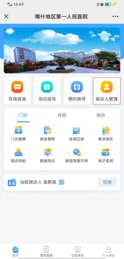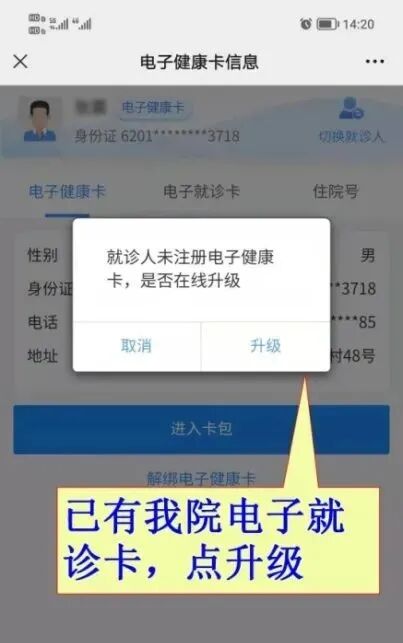 (二)点击“就诊人管理”,注册成功后,系统提示自动升级成“电子健康卡”。