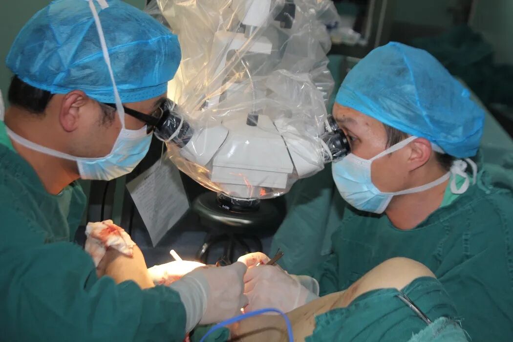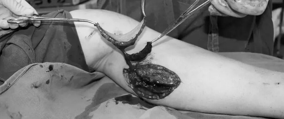 ▲图丨皮瓣切取完成“手术用的缝合线比头发丝还细,肉眼下根本看不见,所以吻合血管必须在手术显微镜下进行,术者喘口粗气就有可能将血管撕裂从而导致手术失败,由于这台手术吻合的血管是穿支对穿支,运用了超级显微外科技术,但此类手术对手术显微镜的要求极其苛刻,我们在手术显微镜比较简陋的条件下,克服困难完成了这个手术,也是我们团队不畏艰难困苦,迎难而上,勇攀医学高峰的坚强的意志体现!”李成志组长介绍道,此手术最关键、最难的步骤就是吻合血管,想要保证皮瓣的动脉供血和静脉回流通畅,我们就必须保证吻合口质量,好在烧伤整形创面修复小组技术过硬,且精诚合作,还是顺利拿下了此手术。