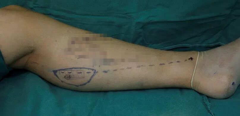 ▲图丨皮瓣设计次日,在肛肠烧伤小儿外科王晓学主任的主持下,烧伤整形创面修复小组组长李成志、组员孙向东、乔维龙做了周密的术前讨论,最终确定使用腓肠内侧动脉嵌合穿支皮瓣游离移植术为麦麦提大叔修复足部创面。