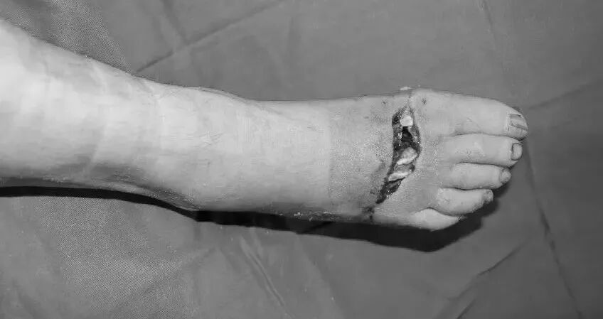 1个月前,在家建房的麦麦提大叔(化名)在搬运钢管时不慎被钢管砸伤右足,导致第1-5跖骨骨折,部分足背皮肤坏死,当地医院虽然给予了骨折复位并固定,但足背皮肤出现的缺损、足背肌腱的外露问题却未能得到解决。由于技术条件有限,当地医院遂联系我院转至肛肠烧伤小儿外科进行进一步治疗。