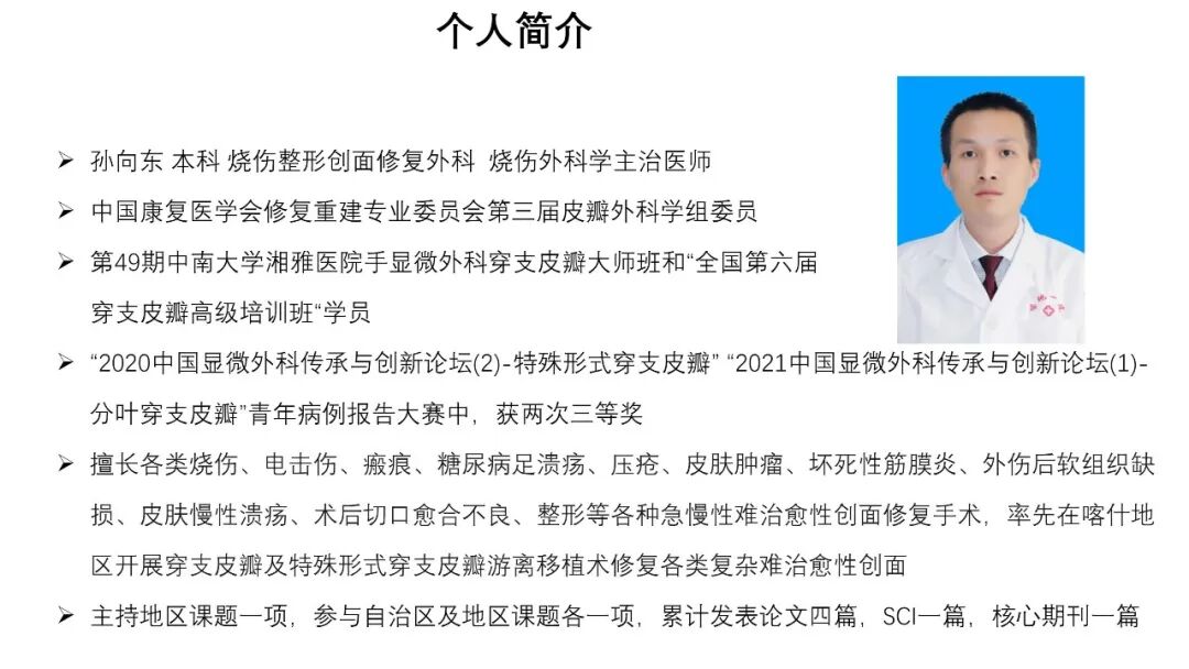 ▲图丨术后据悉,我院肛肠烧伤小儿外科烧伤整形创面修复团队于2019年开展了本地区首例股前外侧穿支皮瓣游离移植术,截至目前已顺利开展了穿支皮瓣游离移植术40台次,穿支皮瓣带蒂转移20台次,包括旋股外侧动脉降支穿支皮瓣、桡侧副动脉穿支皮瓣、腓肠内侧动脉穿支皮瓣、胸背动脉穿支皮瓣、骨间背动脉穿支皮瓣、阴部内动脉穿支皮瓣、腓动脉穿支皮瓣等,成活率达95%,达到国内先进水平,在国内显微修复重建外科领域已经小有名气,且已开展的穿支皮瓣游离移植术修复糖尿病足溃疡创面在疆内已处于领先地位,尤其是开展了分叶、修薄、flow-through、嵌合等各种特殊类型穿支皮瓣在疆内也处于领先地位。这支年轻的团队,正在用他们地努力和汗水,不断刷新着南疆地区穿支皮瓣手术的新纪录。