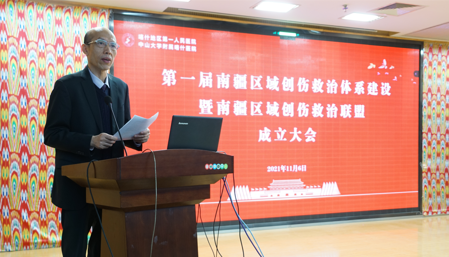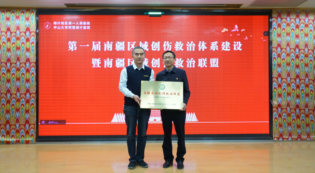 为进一步促进南疆创伤救治体系建设,提高南疆创伤救治能力,11月6日,第一届南疆区域创伤救治体系建设暨南疆区域创伤救治联盟成立大会在我院门诊17楼会议室成功举行。喀什地委副书记、广东援疆前方指挥部总指挥王再华,喀什地区行署副专员古力扎尔·阿布都热合曼,地区卫健委党组副书记、主任凯塞尔·阿不都吾甫尔,北京大学人民医院副院长、国家创伤医学中心副主任王天兵,南方医科大学南方医院副院长杨洪波及我院领导班子成员以“线上+线下”的方式出席会议。会议由吴小剑院长主持。