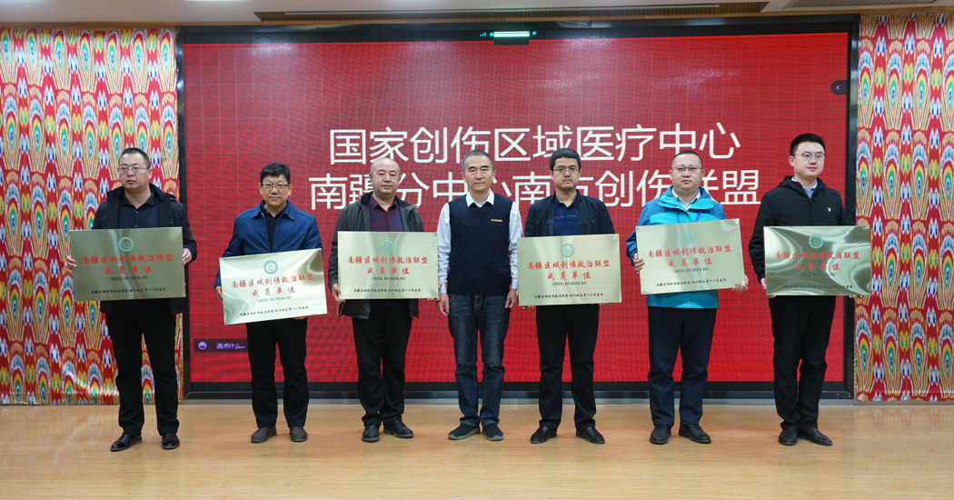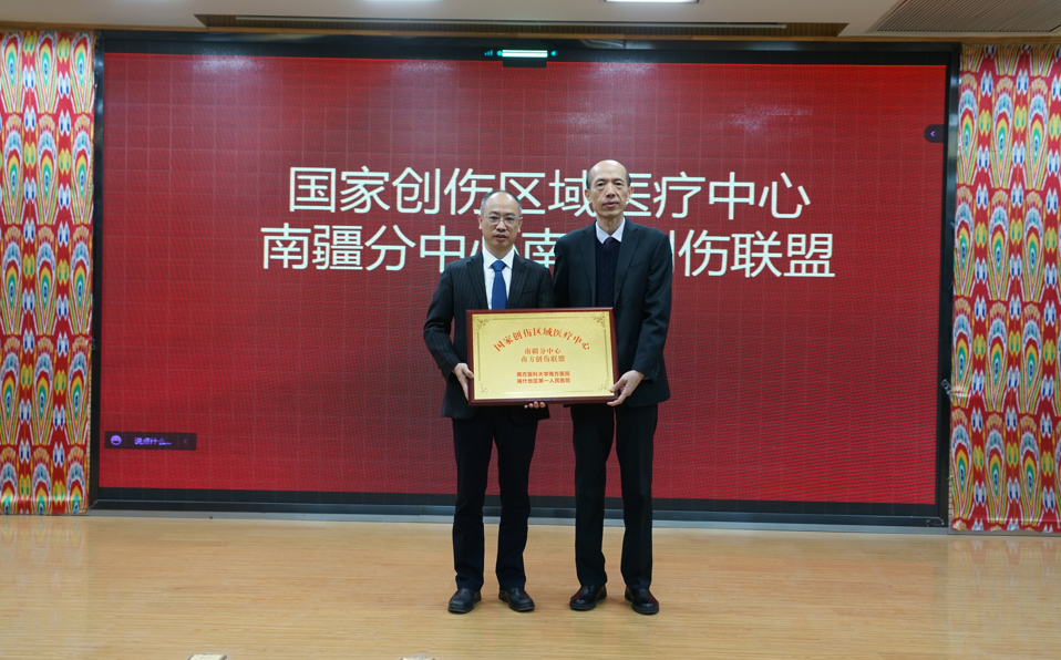 ▲图丨杨洪波副院长向我院授“国家创伤区域医疗中心南疆分中心南方创伤联盟”牌匾