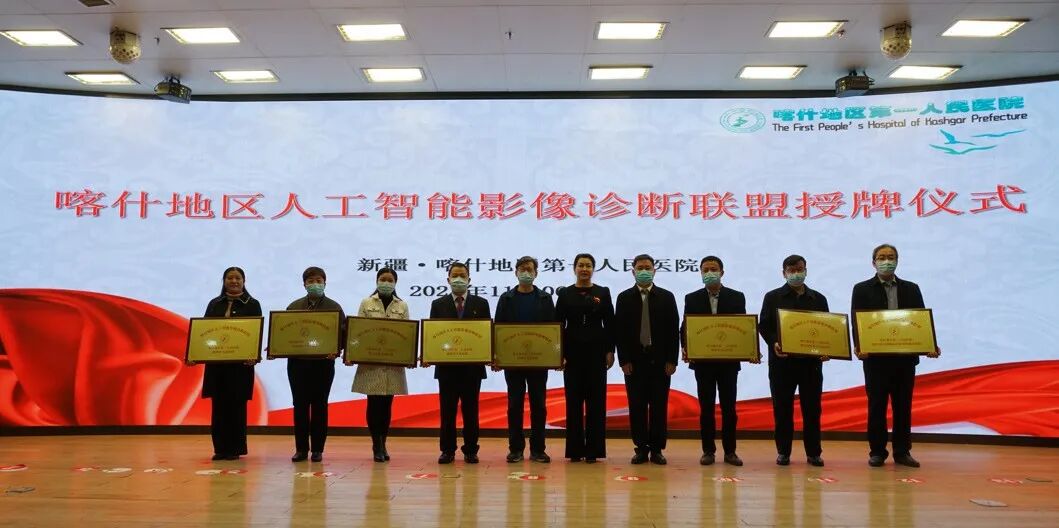 随后,与会领导分别为来自克州、喀什地区各县市及兵团第三师的“喀什地区人工智能影像诊断联盟”成员单位授牌。
