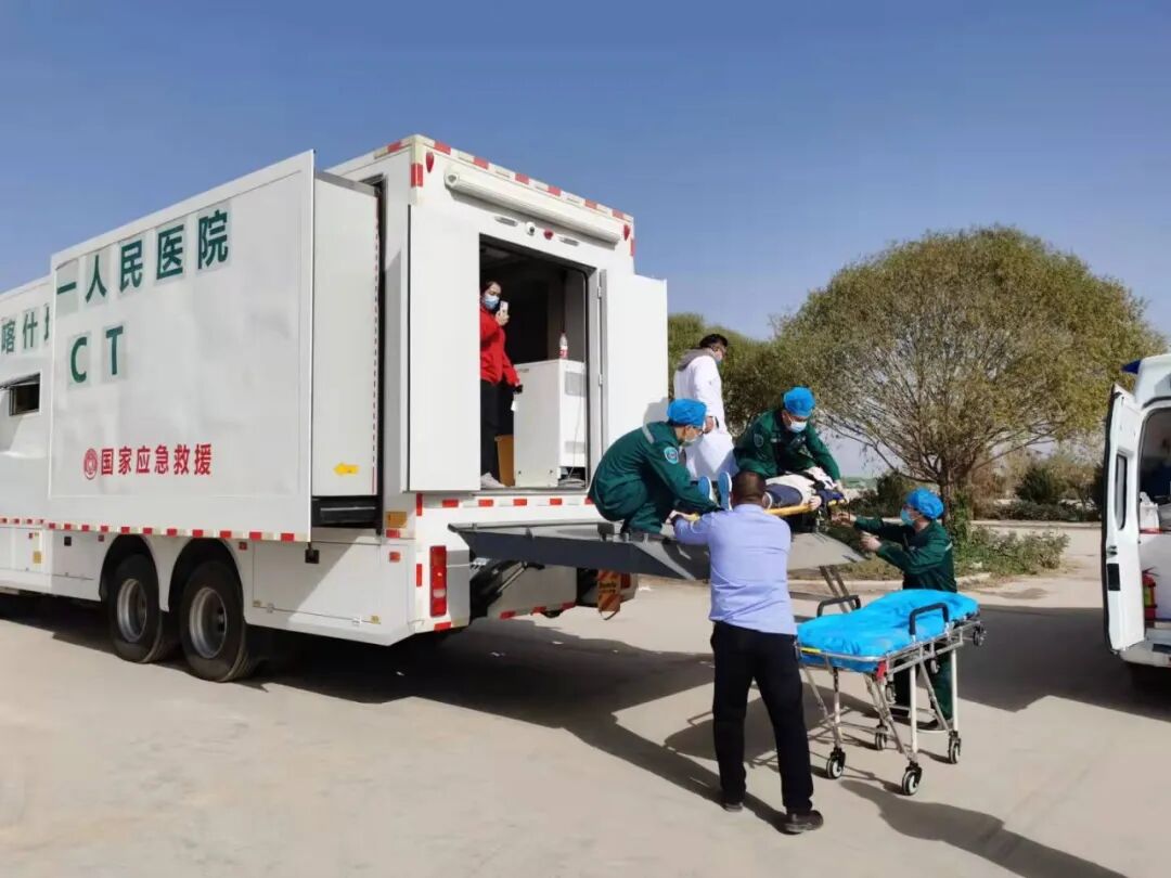 演练模拟喀什地区某县发生6.0级地震,我院在接到地区卫健委紧急通知后,第一时间派出移动体检车、移动CT、移动手术车和救护车,携急诊、重症医学、普外等专业医护团队前往震区开展检伤。