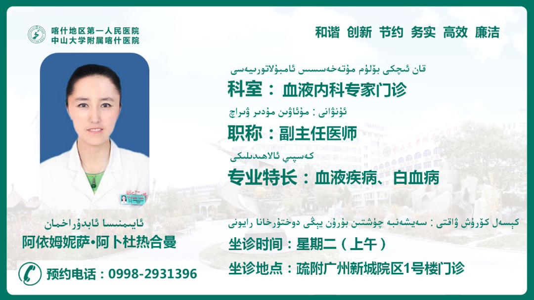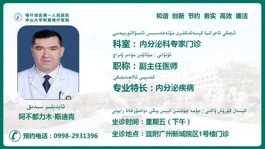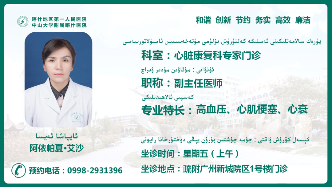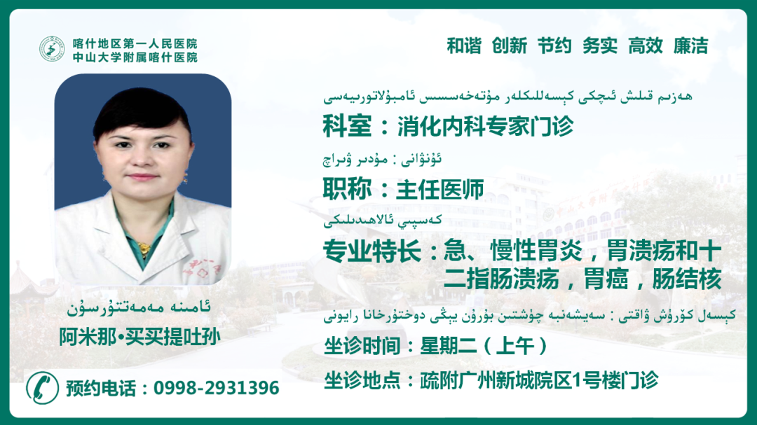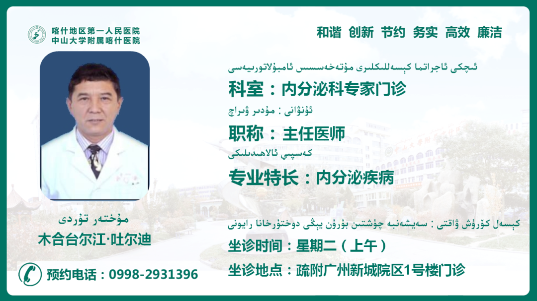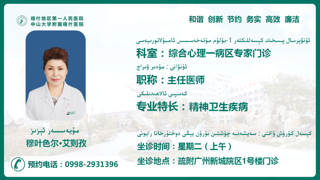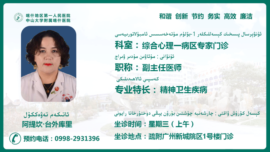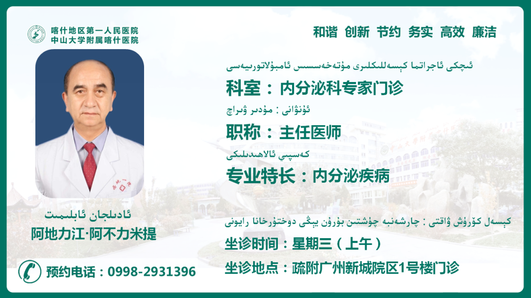 为最大限度满足各族患者个性化就诊需求,我院进一步完善就医环节,精准施策、精细服务,在总院区门诊全方位开诊的基础上,我院疏附广州新城院区新增设以下专家门诊,为就诊患者提供专业的医疗服务和全面的健康指导。![]()