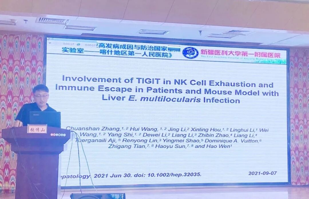 张传山研究员以《Involvement of TIGIT in NK Cell Exhaustion and Immune Escape inPatients and Mouse Model with Liver E. multilocularis Infection》为题进行授课,从科学问题、PVR(CD155)-TIGIT轴、科学平台、研究结果、研究结论及研究后续计划等六个方面进行了分享。